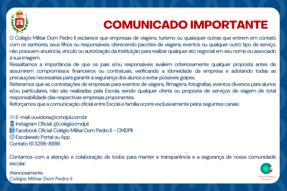 O Colégio Militar Dom Pedro II esclarece que empresas de viagens, turismo ou quaisquer outras que entrem em contato com os senhores, seus filhos ou responsáveis, oferecendo pacotes de viagens, eventos ou qualquer outro tipo de serviço, não possuem anuência, vínculo ou autorização da instituição para realizar qualquer ato negocial em seu nome ou associado à imagem do colégio.