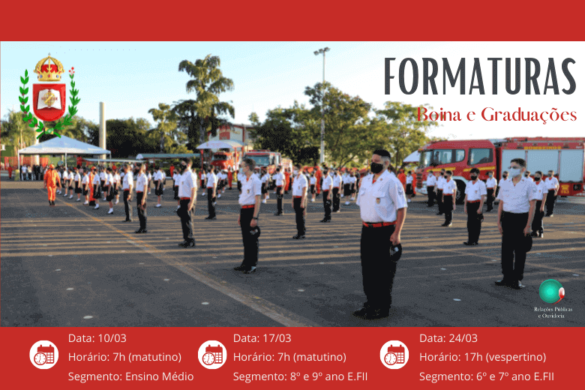 Informamos que as Formaturas de Entrega de Boina e Graduações acontecerão nos dias 10/03 (para alunos do Ensino Médio) às 7h; 17/03 (para alunos do 8º e 9º E.F II) às 7h; 24/03 (para alunos do 6º e 7º ano E.F II) às 17h.
