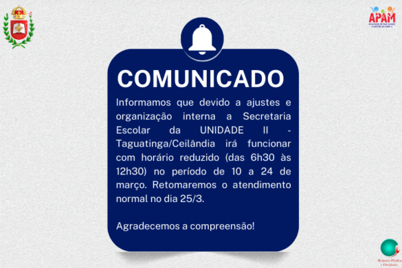 Home Diversos NOVO HORÁRIO DE FUNCIONAMENTO DA SECRETARIA DA UNIDADE 2 – 2025