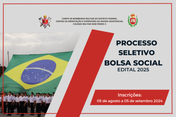 O Ten-Cel. QOBM/COMB. COMANDANTE DO CENTRO DE ORIENTAÇÃO E SUPERVISÃO AO ENSINO ASSISTENCIAL – COSEA, no uso das atribuições legais que lhe confere o art. 4o, inciso III, do Decreto Distrital no 31.817, de 21 jun. 2010, comunica que estarão abertas as inscrições do Processo Seletivo de Concessão de Bolsa de Estudos em Caráter Social do Colégio Militar Dom Pedro II (CMDP II), para o ano de 2025, e instrui os candidatos quanto a sua execução.