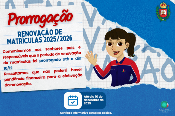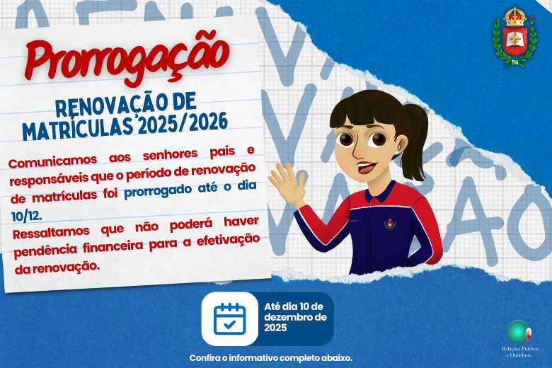 Informamos aos senhores pais e responsáveis que o período de renovação de matrículas foi prorrogado até o dia 10 de dezembro de 2025.
